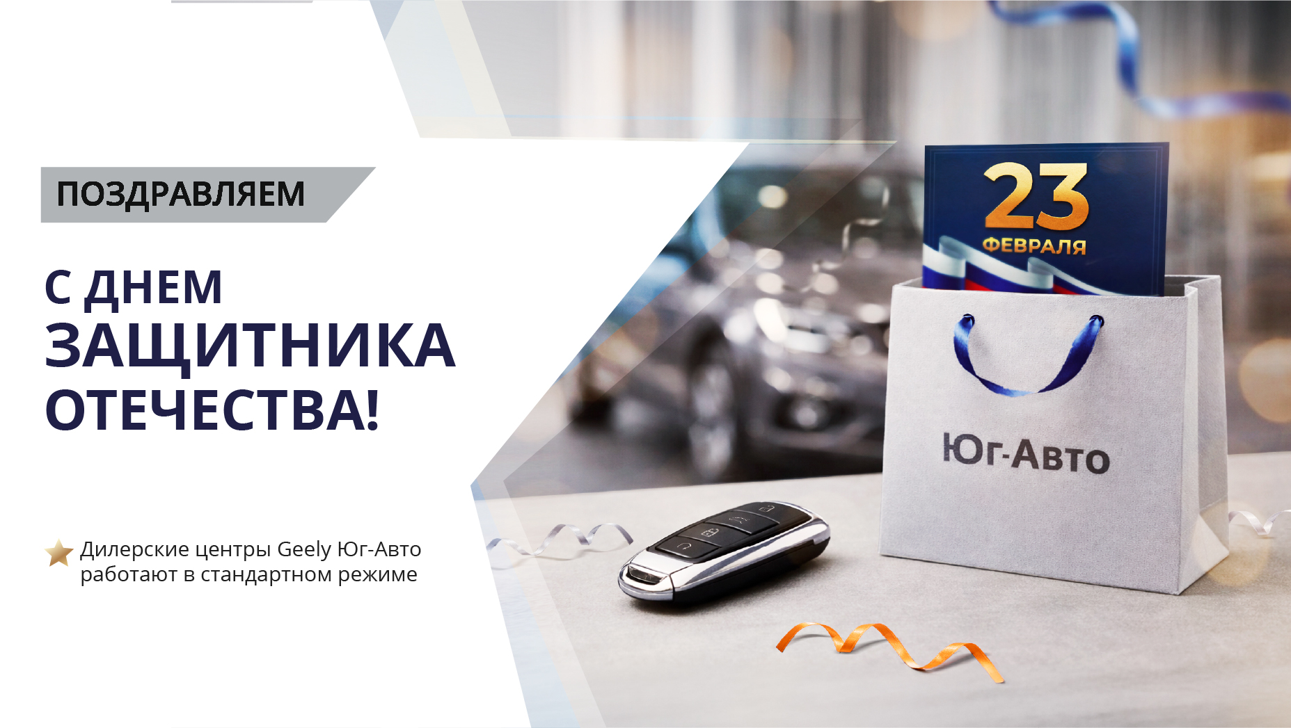 23 февраля дилерский центр Geely Юг-Авто работает в штатном режиме. Ждем вас с 08:00 до 20:00 по адресу: ул. Краснодарская, 3.