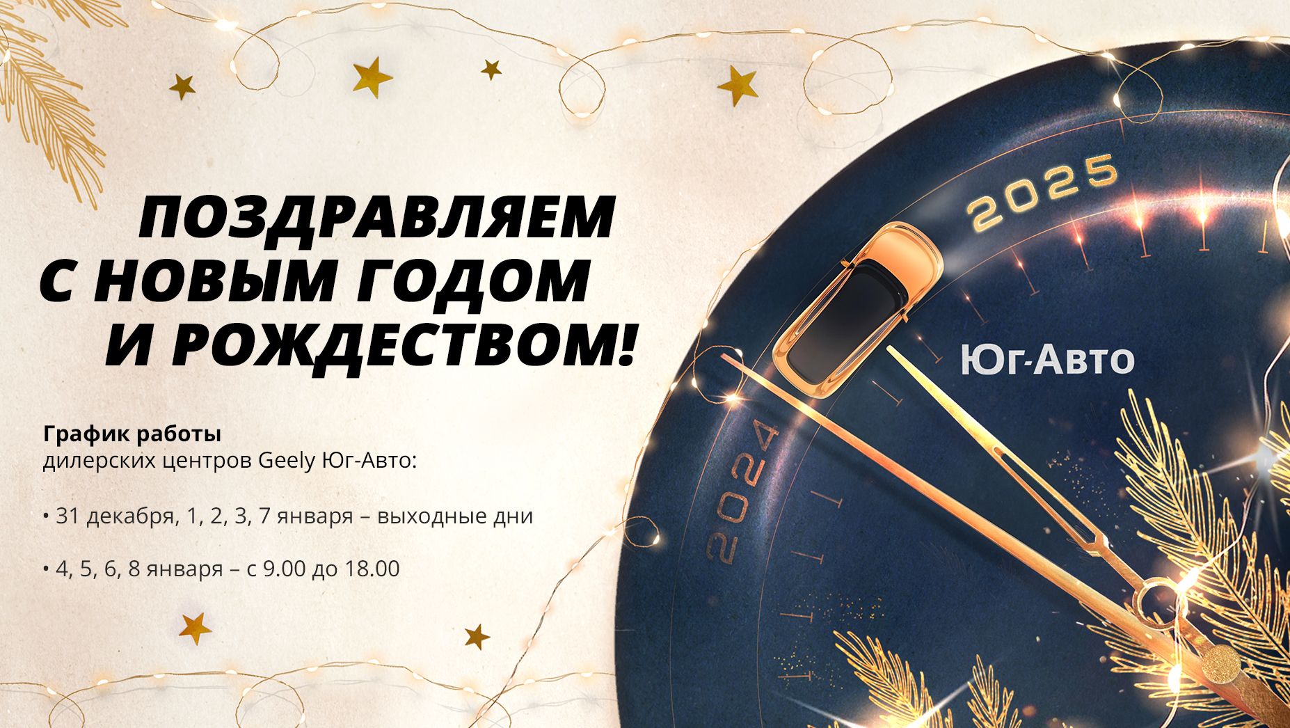 Просим обратить внимание на измененный график работы дилерского центра Geely Юг-Авто: · 31 декабря, 1, 2, 3, 7 января - выходные дни; · 4, 5, 6, 8 января - с 09:00 до 18:00.